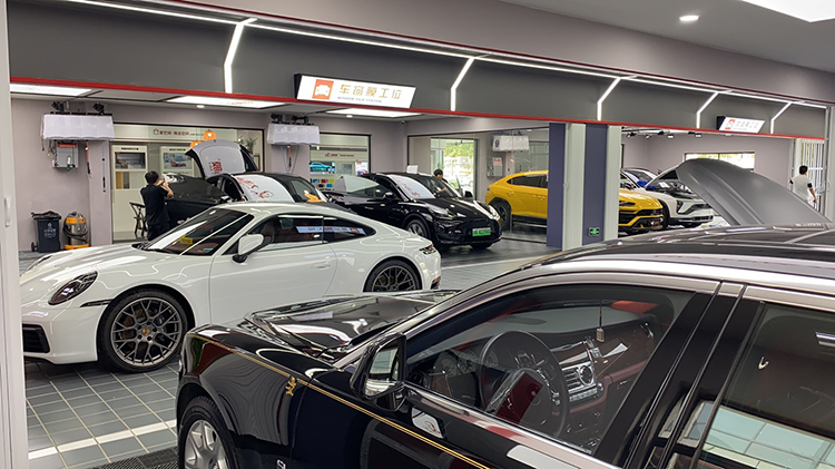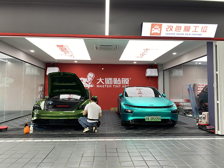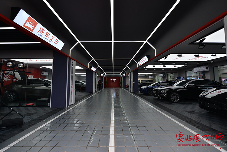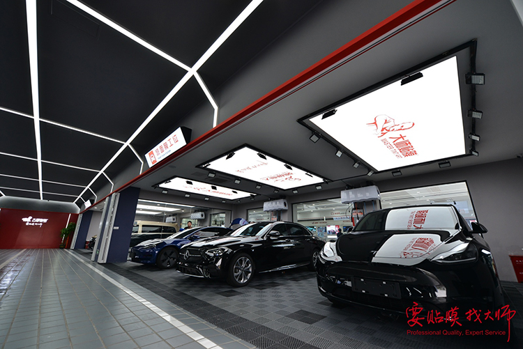 大师贴膜全膜空间旗舰店拥有12个专业贴膜工位,按照功能分区,车窗膜、隐形车衣,改色膜均做了专业区分,配备专用设备,车间隔断、降尘、空调等均有配备。