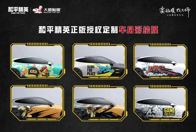 目前,大师贴膜与和平精英已经在全国范围内发布了六款全新联名IP车身彩绘膜和十八款「和平黑话」车贴,让汽车车身彩绘变得更有特色,也为各位车主驾驶爱车出行的旅程增添了更多趣味。