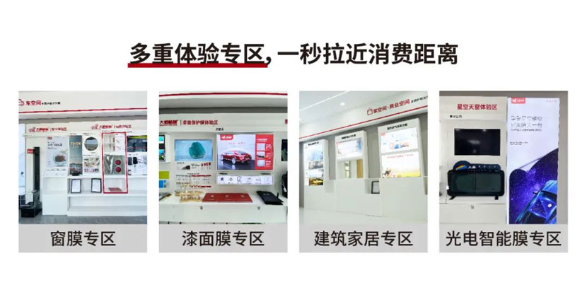 从“以货为始”到“以场为始”!大师全膜空间旗舰店基于业态进行“场景化”布局,通过窗膜专区、漆膜专区、建筑家居专区、光电智能膜专区……等真实使用场景入手,进行直观接地气的产品演示,瞬间拉近产品与消费者的距离,给消费者带来更直观的冲击和购物方式的颠覆式体验。