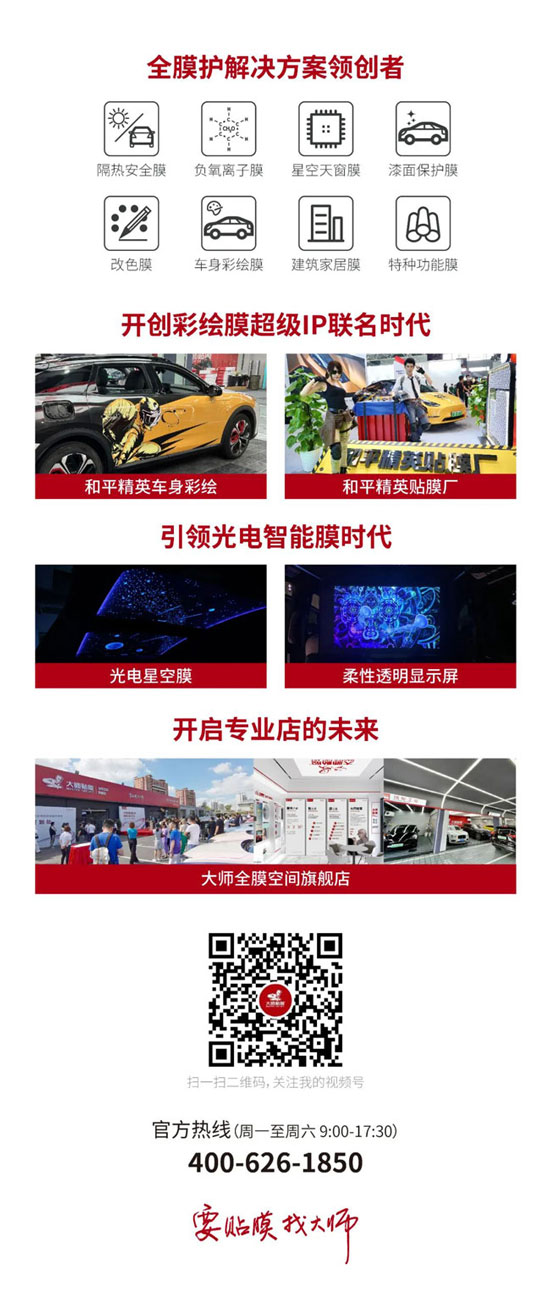 聚焦膜,但不单一!大师全膜空间旗舰店专注膜品服务,不止汽车窗膜/漆面保护膜,而是提供车空间、家空间、公共空间的全膜护解决方案。汽车膜、漆面保护膜、建筑家居膜、光电智能膜、特种功能膜……全膜解决方案,一店拥有!