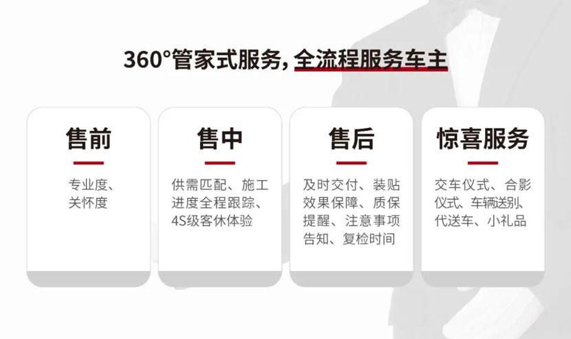 大师“360°管家式服务”,涵盖售前、售中到售后关怀全程,除了提供全方位的专业贴膜服务,还提供急速交车、施工全程跟踪、4S店级客休体验、代送车、代检车等创意贴心服务。真正做到想车主所想,做到周到、专业、车主放心,让贴膜真正从施工走向服务,最大限度提升门店口碑与美誉度。